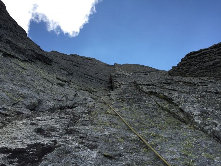 Predzadnji raztežaj. Ni lahko, niti malo ne. Razdelila sva ga v dva dela in ga uspešno pospravila v kot. Zadnji raztežaj na rob stene se začne pri vidnem zobu daleč zgoraj.