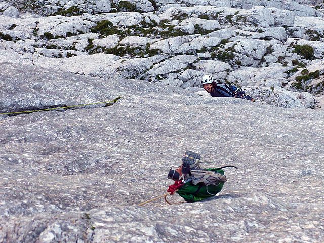 Grma me je s svojim lahkotnim poplezavanjem zavedel, tako da sem najtežji cug najprej mislil plezati kar z nahrbtnikom. Še dobro, da sem ga potem na Grmin predlog privezal na polovičko. Se je bilo treba zgoraj pošteno napet