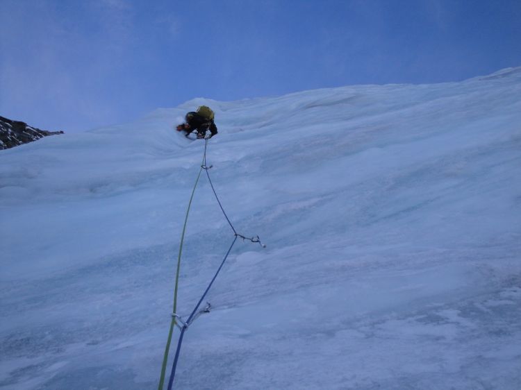 Plezanje v spodnji, strmi polovici 500-metrske ledeniške stene.