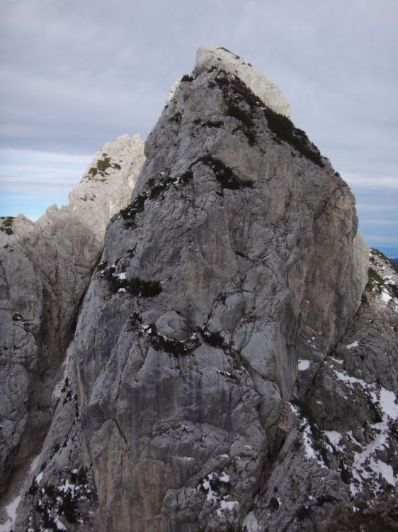 Z vrha Rušice nekaj časa poplezavaš navzdol, potem pa sledi neizogiben spust v škrbino.