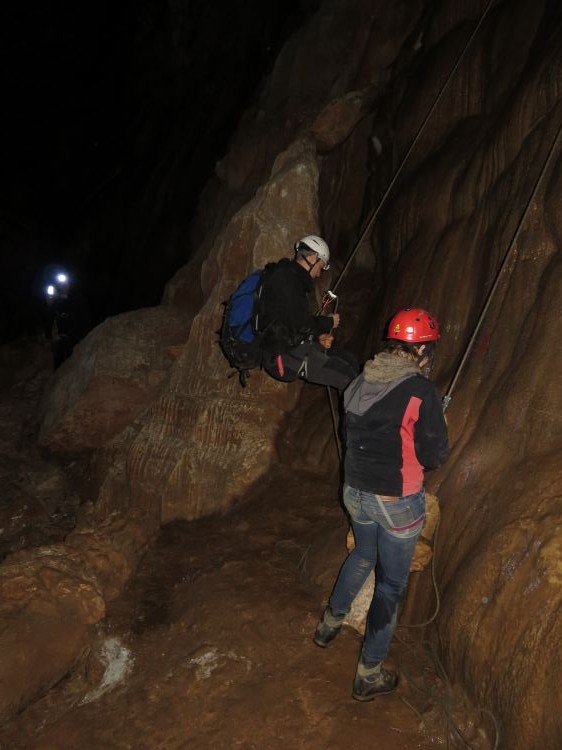 Najbolj napetih trenutkov v jami, to je plezanje iz tega mokrega sluzastega brezna nismo posneli. Jurij je z ekipo je v pomoč plezajočim na vrhu demonstriral hitr simpl način reševanja padlega. Imenuje se povuci potegni.