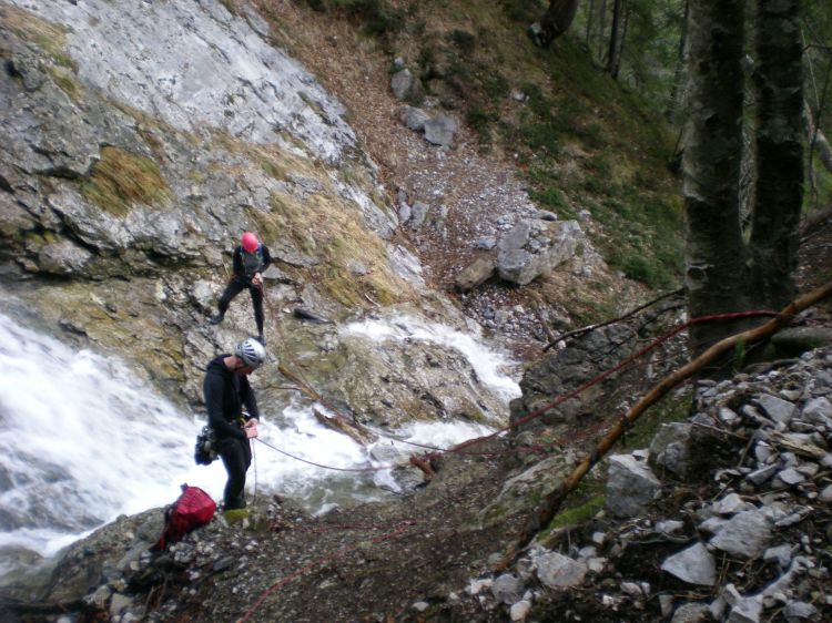 Za vsak slučaj ju pozihram, pa smo bli vsi varno čez. Kasneje smo naredili dva raztežaja po Razu Golarjeve peči, pa raje potem obrnili, ker hitrost ta dan ni bila naša vrlina. Zato smo se vrnili na izhodišče in šli splezat krajšo smer - Raz stolpa v Jameljsko peč.