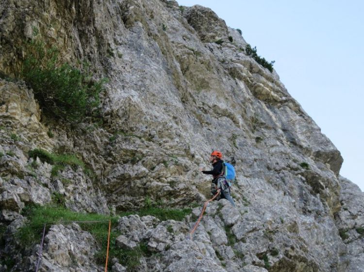 Strma in težavna stena drugega raztežaja (ključno mesto drugega raztežaja).