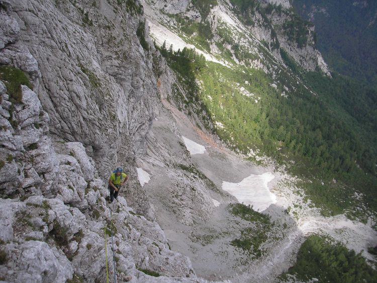 Že visoko v steni, kjer je nekaj lažjih raztežajev.