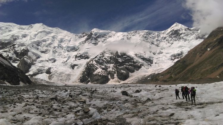 Dvanajst kilometrov dolga in dva kilometra visoka stena je bila čedalje bližje (skrajni desni vrh na fotografiji je 4859 metrov visoka Gestola).
