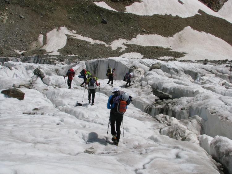 Čim bližje smo bili steni, tem bolj razbit je bil Bezengijski ledenik in več razpok je bilo treba prečkati.