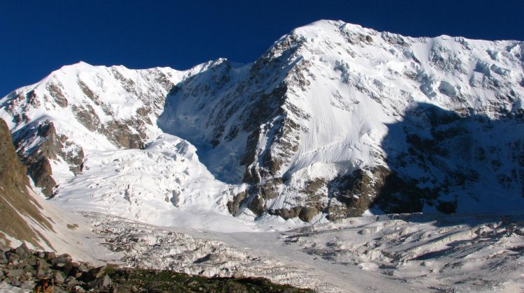 Razgled od bivaka Džangi-koš na vzhodni vrh Šhare (4866 m) in glavni vrh Šhare (5203 m) v Bezengijski steni.