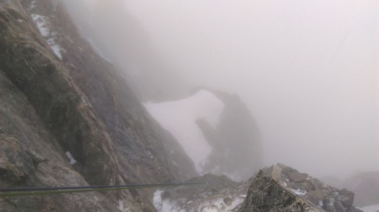 Ko sva se spustila do prvega sidrišča za spust tik pod snežnim grebenom, se je sneženje spet nadaljevalo in v greben nedaleč stran od naju je udarila strela. Nadaljevala sva sestop in do vznožja skalnega dela smeri opravila več spustov po vrvi.