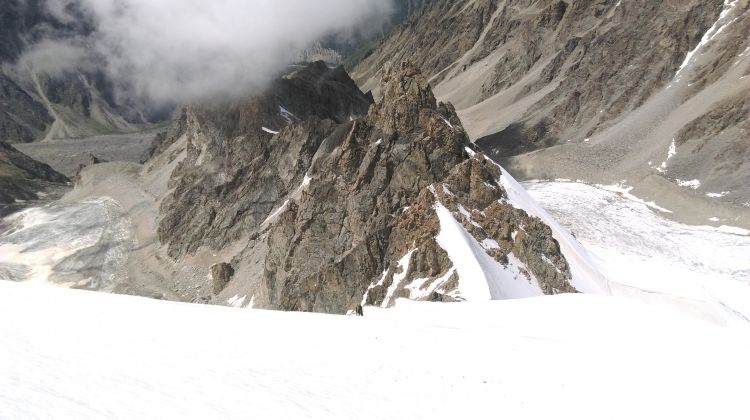 Pogled z vršnega snežno-lednega pobočja Dumale nazaj na SZ greben in na povezovalno snežno sedlo.