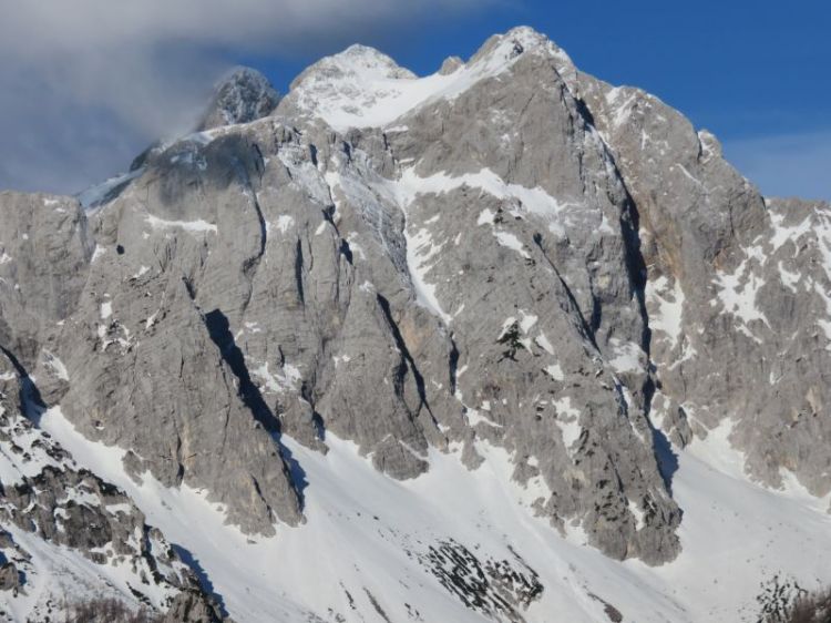 Še vedno zasnežene stene nad Okrešljem in dobro viden Steber Štajerske Rinke, ki mi bo za vedno ostal v spominu