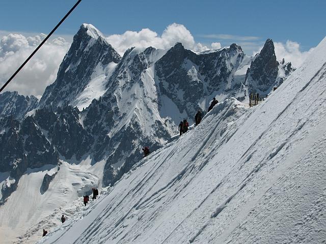 Ko zapustiš varno zavetje oz. izhod iz enega izmed tunelov na Aiguille du Midi te čaka izpostavljen sestop po V grebenu, visoko na S steno.