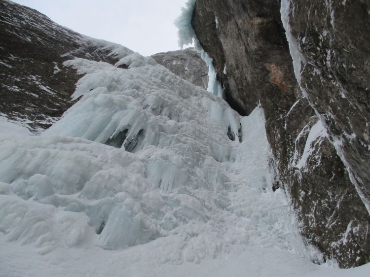 Je kar hud ta cug, plezaš na noge, razkorak, malo se zaguziš tudi ob steno, kdo je vedel, da je led lahko tudi malo previsen
