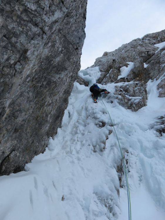 Peter, v najtežjem raztežaju tega dne. Glavne težave so bile nepredelan sneg, ki ni držal človeške teže, razmeroma slabo varovanje in ledno-snežni previs. Bilo je potrebne precej atletike, moči, za prvega pa tudi precejšnjo mero dobrih živcev.