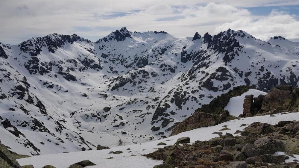 Odprl se mi je pogled na Circo de Gredos, osrednji del z najvišjimi vrhovi, ki tvorijo venec okoli jezera, ob katerem stoji koča. Koča se na sliki vidi, jezero pa je skrito pod snegom.
