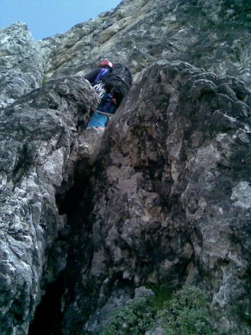 Koc napada ključni raztežaj smeri Direttissima v Visoki polici.