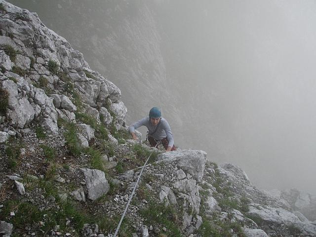 Prvi rastežaj je deloma potekal v megli, ki naju je zajela.