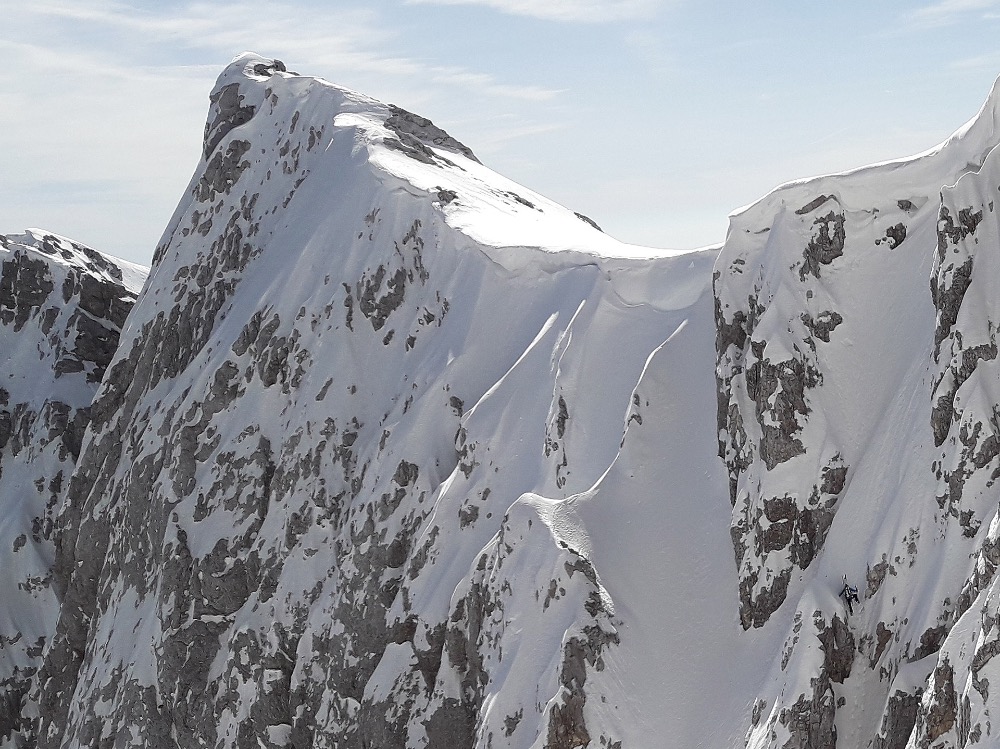 Najprej sem zarinil naravnost pod ogromno previsno opast. Nato sem sestopil do prehoda v levo...