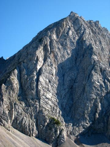 Smer poteka po dobro vidnem sistemu kaminov in zajed v levi strani stene, izstopi 100m pod vrhom.