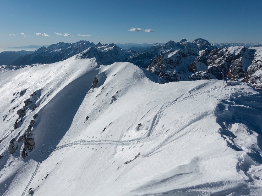 Križ in smuče na Bavškem Grintavcu. Zadaj Viš, Montaž...