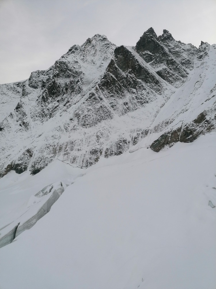 Pred nočnim počitkom si od daleč ogledamo zastavljeno nalogo, ki nas čaka naslednji dan. Mayerlrampe in nad njo SZ greben do vrha.