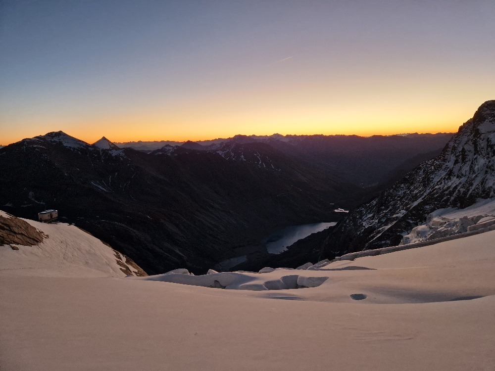 Po prijetni noči v bivaku se nam prav nič ne mudi v mrzlo jutro. Vseeno pa nas jutranja zarja nekaj čez 6h pozdravi, ko smo že na poti pod steno.
