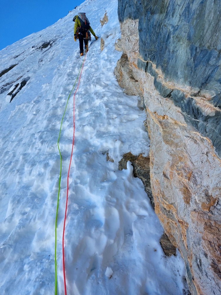 Opreme imamo dovolj za vse razmere zato Primož potegne naprej proti zgornjemu delu smeri.