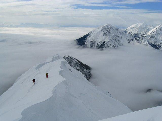 Prekrasen pogled na zasnežene vrhove, ki štrlijo iz morja oblakov.