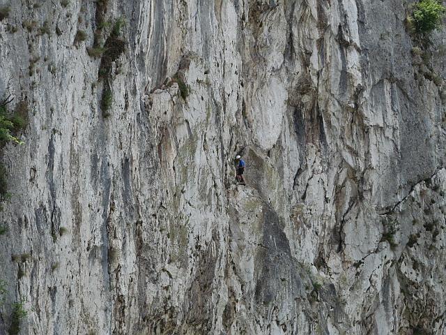 Sledili so resnično vertikalni spusti, pogostokrat čez previse, tako, da si visel na vrvi kot posušena klobasa. Vmes sem naredil posnetek na plezalce, ki se spopadajo z veliko težjimi smermi.