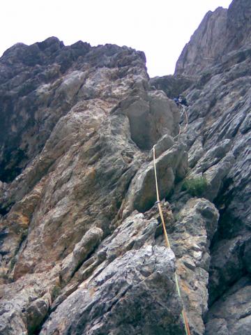 Katja v ključnem raztežaju smeri Dimai, Punta Fiames