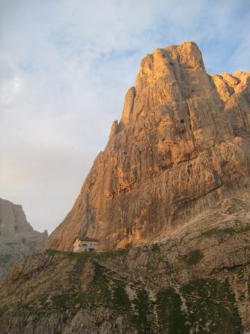 Rifugio Velo pod Madonno. Po levem razu gre raz tančic