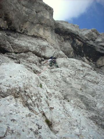 Proti previsom... in malo nad mestom, kjer se je kasneje plezalki v navezi malo za nama odkrušil blok - zoprn 8m padec po gredini se je končal glede na videno še dobro: "le" z zvinom (zlomom?) gležnja in počeno čelado, kot sva izvedela kasneje...