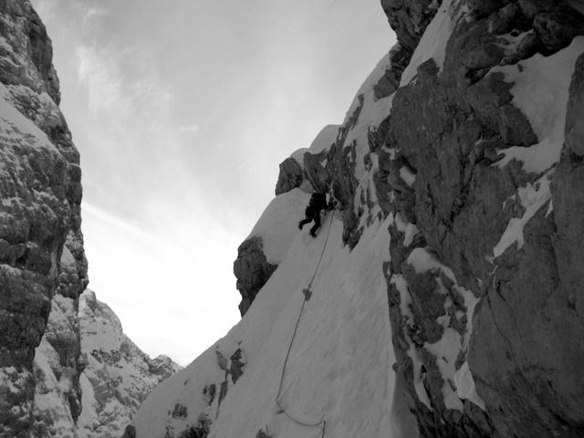 prečka pred izstopom iz Teranove grape. Stransko prečenje z derezami, ko je pod tabo prepad je lepa izkušnja. Vse delaš počasi, z občutkom in predvsem varno.