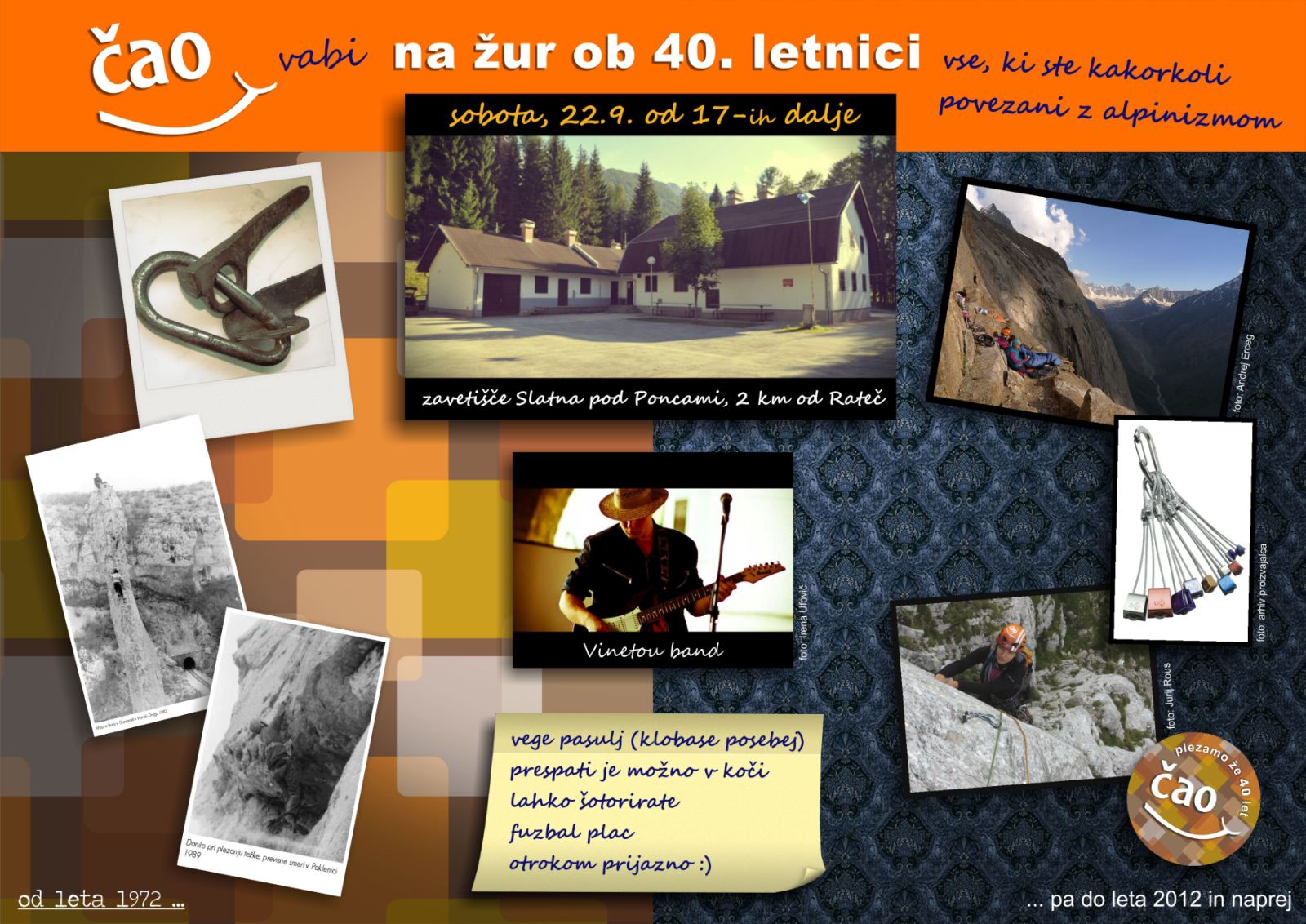 ČAO letos praznuje 40 let njegovega delovanja, zato smo se odločili, da v soboto, 22.9.2012 organiziramo dober žur, na katerem ne smeš manjkati tudi ti. Dogajalo se bo od 17.00 ure dalje na planinskem zavetišču Slatna (to je obmejna karavla nad planiškimi skakalnicami).