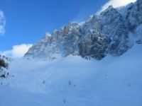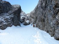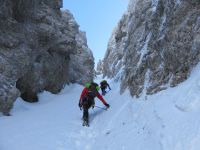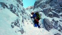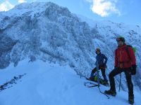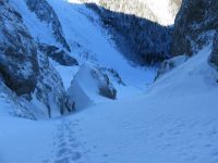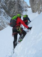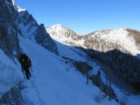 Prečenje snežnih pobočjih ob krajni poči nad dostopno grapo. ![]()