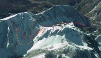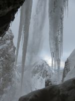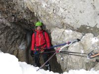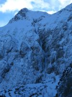 ). Že takoj na začetku naletim na dobro zabit klin, ki je bil tudi edino solidno varovanje. Nato pa z desno roko zahakljam cepin ter se potegnem tako visoko, da lahko naredim soliden razkorak in se stabiliziram na konicah derez (skok je bil namreč spodaj izpodjeden). Zatem mi je takoj postalo jasno, da ne bo lahko. Nadaljevanje je bilo namreč solidno strmo, skala zelo krušljiva, varovanja ni bilo mogoče namestiti, za dereze pa tudi ni bilo kake solidne opore. Vseeno fajtam počasi dalje in uvidim neko možnost slabšega varovanja z gurtno, ki jo napeljem okoli podrtih skal, ki so začuda nekako za silo držale. Vmes se userjem in se vrnem nazaj (ker to itak ne bo šlo) nato pa po ponovnem ogledu še enkrat poskusim in prilezem nekoliko višje. Kopljem s cepinom v eno rupo iskaje mesto za klin. In glej ga zlomka najdem še en »zabit« klin v krš, ki pa ga izruvam z golo roko. Nasmeh na obrazu hitro zvodeni. Vso zadevo dobro očistim in zabijem enega kao dobrega profilca, ki je kasneje celo sam zletel ven. Ker sem imel kao eno dobro varovanje, sem se nekoliko opogumil in lezel previdno dalje do višine, kjer sem lahko okoli skal napeljal še eno gurtno in namestil dva frenda. V nič od navedenega nisem bil 100%, saj je bilo vse podrto... Vmes se mi zruši še en stop in nove gore-tex hlače dobijo nove luknje. Bil sem sicer na višini, kjer bi moral le še zabiti en dober klin, nato pa se zavihteti okoli roba, nekoliko navzdol, da bi dosegel dno grape nad skokom. Dejansko je bilo to mesto zelo sitno in je zahtevalo manever, katerega brez dobrega varovanja nisem želel izvesti, saj bi tvegal padec, pri čemer bi lahko naredil fršlus. Ker solidnega varovanja tudi po več poskusih nisem uspel narediti, sem se odločil za povratek na način, da me je Niko kar najhitreje spustil nazaj pod skok (da ja ne bi kako varovalo slučajno popustilo pod mojo težo). Cena tega poskusa je bila ta, da smo v skoku pustili dva frenda, gurtno, en podaljšan sistem, pa verjetno še kakšno vponko, pa seveda naluknjane hlače. Super, si rečem sam pri sebi. Naredil pa vse, kar je bilo v moji moči, da bi se skobacali čez in nadaljevali pot do vrha. Žal ni šlo, torej prihodnjič, ko bom malo več snega, ali pa bo ta vsaj solidno nalepljen na ta krš od skale.«