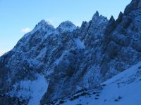 Naši upi o krajšem pristopu in eni izmed težjih, krajših grap na skrajnem zahodu pogorja so se razblinili ob prvem svitu, saj so prav vse grape letos bile zelo skopo obdarjene s snegom. Najbrž so manjko sončnega sevanja na tej strani in močni severni vetrovi poskrbeli, da se je gora sproti otresala snega. Preostalo nam ni drugega, kakor da v upanju na ugodnejše pogoje nadaljujemo z vzponom proti Hajneževemu sedlu. Jurij: »Prontarska ali pa Dolinarjeva morata biti v boljšem stanju!«