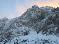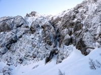 Smer: Poskus vzpona po Avstrijski grapi (III/2, 350m, 35-45°) v severni steni Velikega vrha (Košuta)