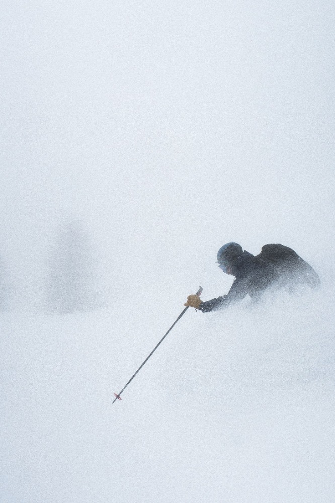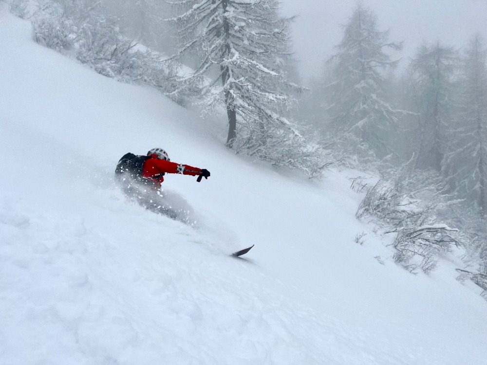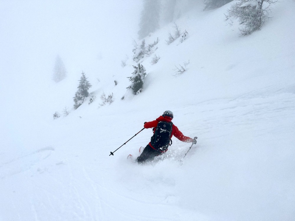 Vidljivost sicer slaba... Sneg pa z vsakim metrom višine boljši. Zgornji del res dobr. Nižje dol pa se mu je poznalo, da je pretoplo...