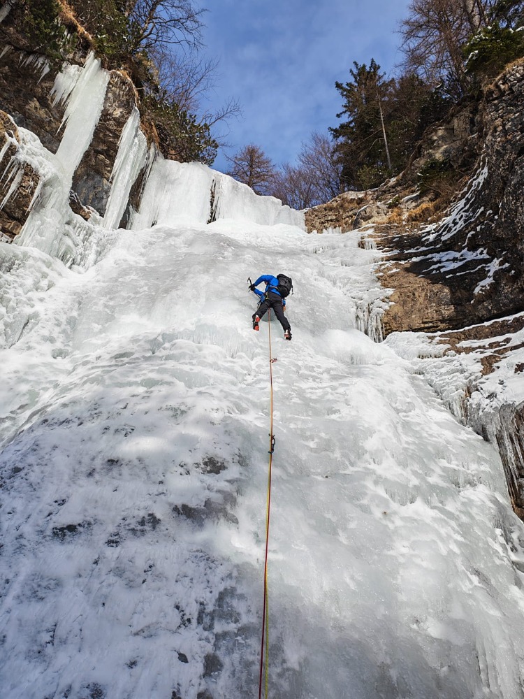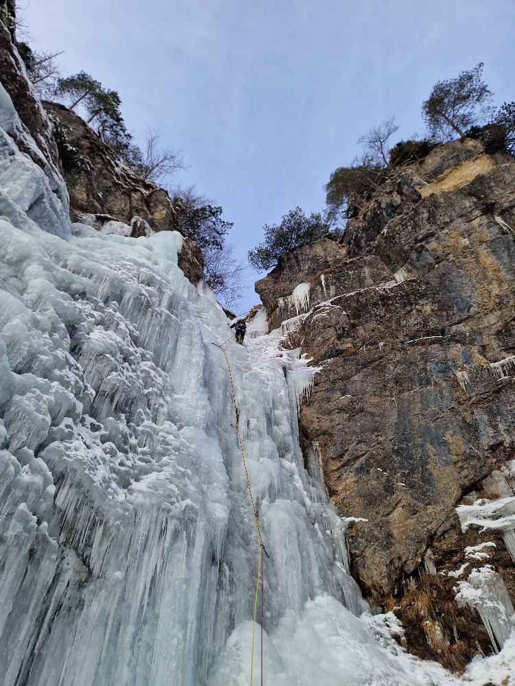 Malo pred osmo sva bla že na parkingu zraven vojaškega topa/bunkerja, pa so naju 2 naveze že prehitele. Za nama pa se je usulo še vsaj 5 navez. Spodnji slap je lepo narjen, v levem delu edin mal teče voda pod ledom. Pol sledi mal poplezavanja po soteski s parimi krajšimi skokami. Vmes se nama je obema polomu led pod nogami v nekem tolmunu, pa sva čofnla notr, js do kolen, Gašper do pasu 😆 Da neb zmrznla sva pol zbrala krajšo desno varjanto, ki te prpele do izstopne potke. Desni slap je že bil mal na soncu in pod ledom že povsod teče, ampak zaenkrat se še vse drži kar kompaktno skupaj. Levi pa je zgledal veliki bolj mikaven, ker je ceu čas v senci. Je pa ob poti do Rabeljskega jezera, še par lepo pomrznjenih slapov, ampak zarad razmočenih čevlov je blo to to za dans 😀