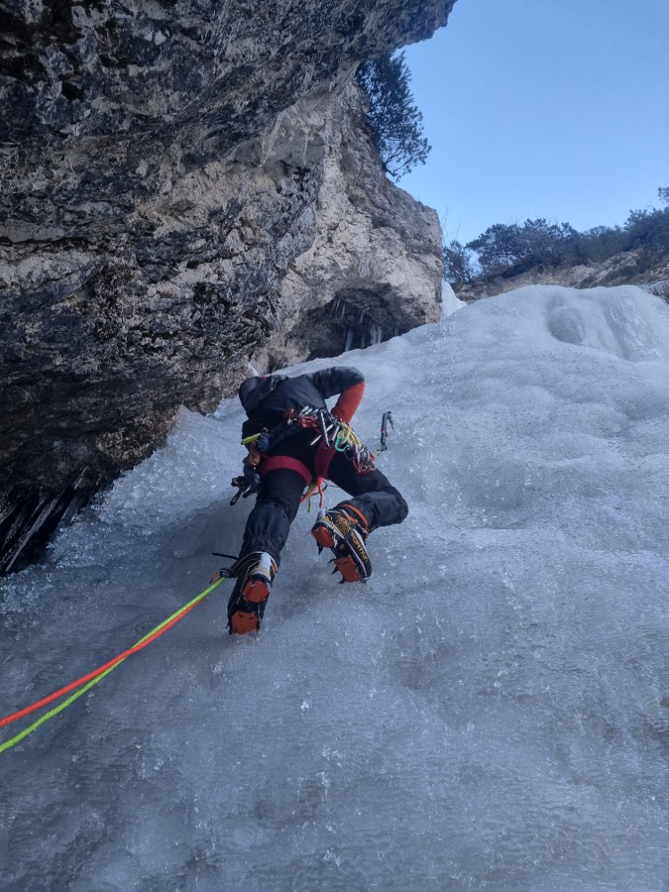 Kljub zelo nizkim temperaturam je po slapu precej teklo, tako da sva imela na vrhu čisto pomrznjen/trd štrik in komplete.