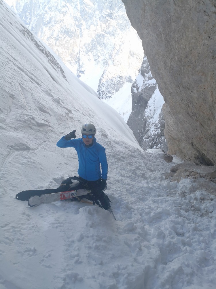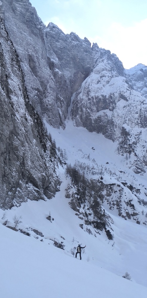 Kar dobre razmere v grapi - ne pretrd sneg. K sreči nismo bili čisto ta prvi in je nekdo že opravil najtežje delo gaženja. Po spustu sva s Crnijem šla še do vrha flanke pod Strugom. Cca 1600 m višinske razlike v celi turi.