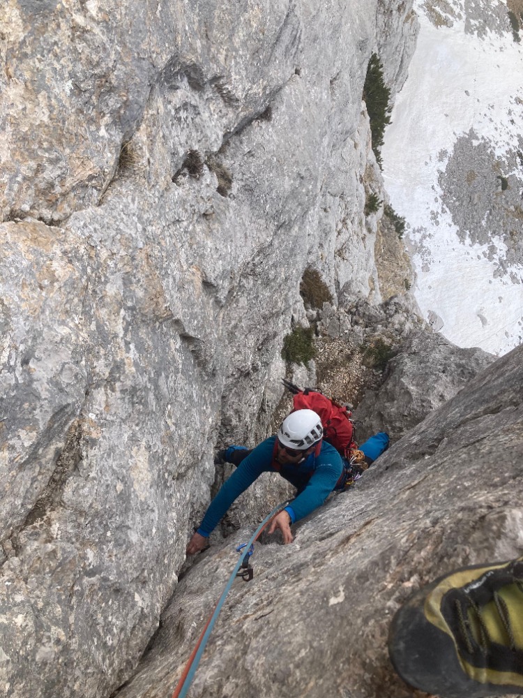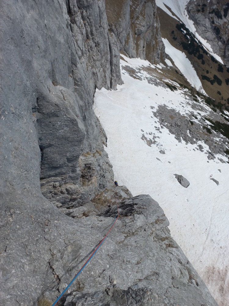 Dobra izkušnja. Prva dva raztežaja sem preplezal precej malodušen, varovanje se mi je zdelo preskopo za udobno plezanje in glava nekako ni želela preklopiti na izpostavljeno plezanje v skali. Na srečo je bil Miha bolj zagnan in navdušen, tako da je vlekel navezo do vrha, predvsem mentalno, pa tudi fizično, saj je odločno in suvereno odplezal najtežje raztežaje